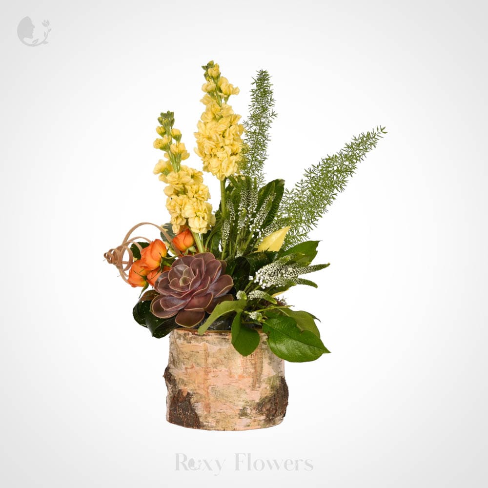 Dacă vrei să dăruiești un aranjament floral plăpând și din care să-i rămână și o plantă pentru mult timp din compoziția acestuia, acesta poate fi alegerea ideală! Suculenta Echeveria reprezintă piesa de rezistență a acestui aranjament, dar foarte bine integrat printre matthiola și sprayroses orange, toate acestea într-un vas armonios de lemn.